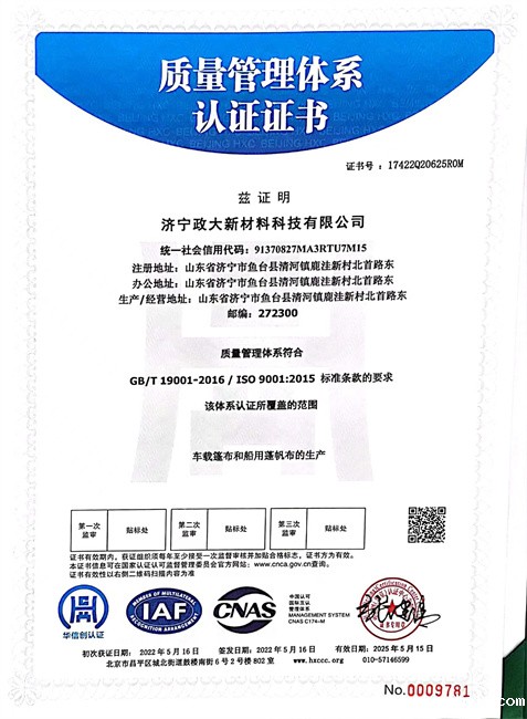 济宁政大新材料科技有限公司,成立于2020年,位于山东省济宁市,公司专业生产加工各种高端PE面料篷布,十余年的生产研发经验,拥有专业的研发团队和质检团队。